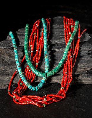 an eight-strand coral necklace accented with rolled turquoise and silver beads; not marked
