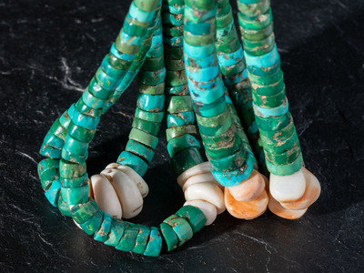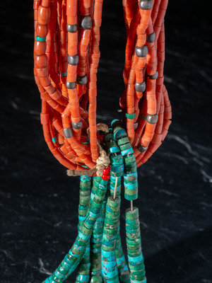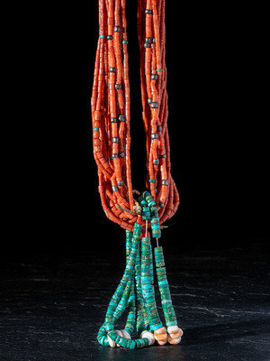 two necklaces, a three-strand and sixteen-strand; strung with coral and spaced with rolled turquoise and silver beads; attached together with two pairs of rolled turquoise and spiny oyster joclas