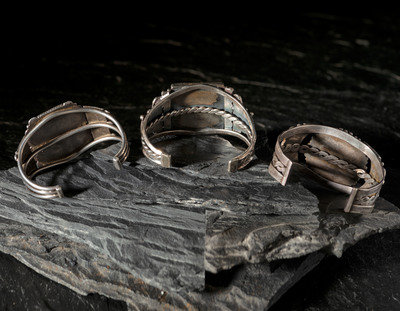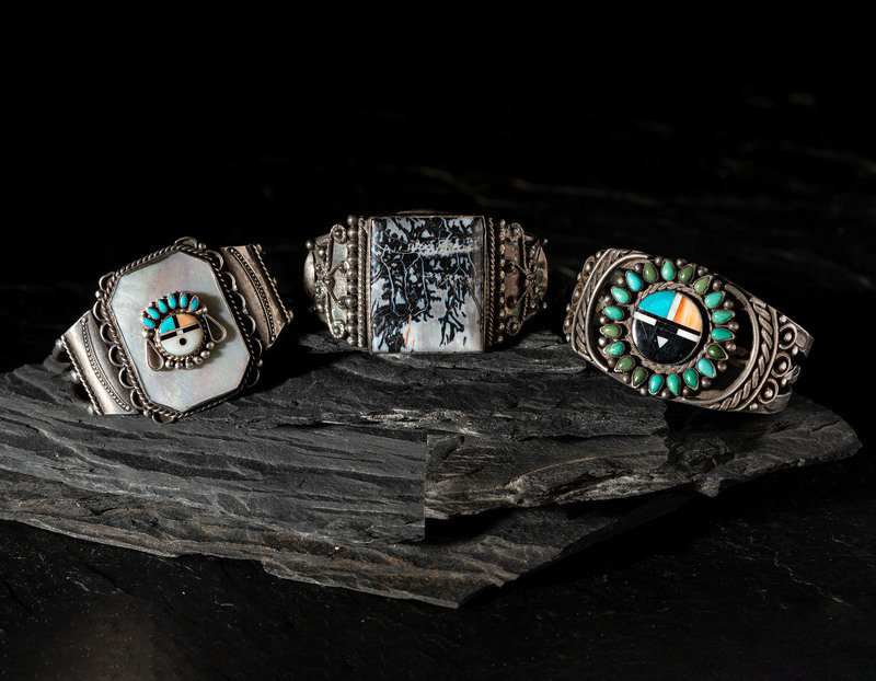 Navajo and Zuni Silver Cuff Bracelets, with Inlay