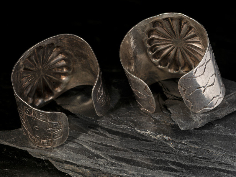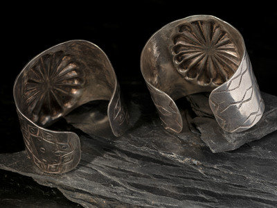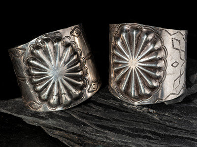 lot of 2, both heavily stamped accentuating a central repousse design; not marked, sizes include: