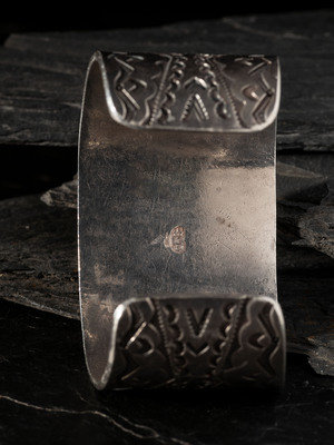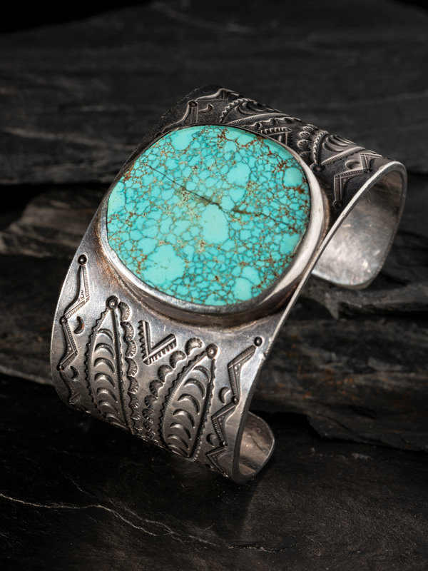 Wide and Heavily Stamped Man's Cuff Bracelet, with Large #8 Turquoise Cabochon