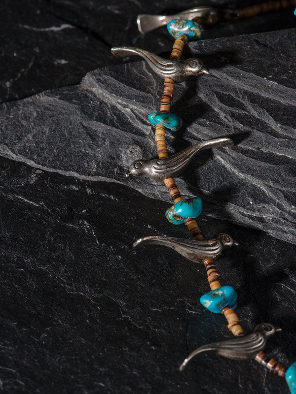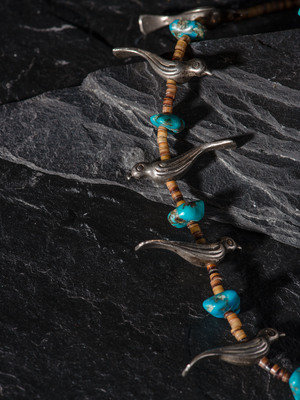 single-strand necklace strung with heishi and alternating silver bird fetishes and turquoise nuggets; not marked