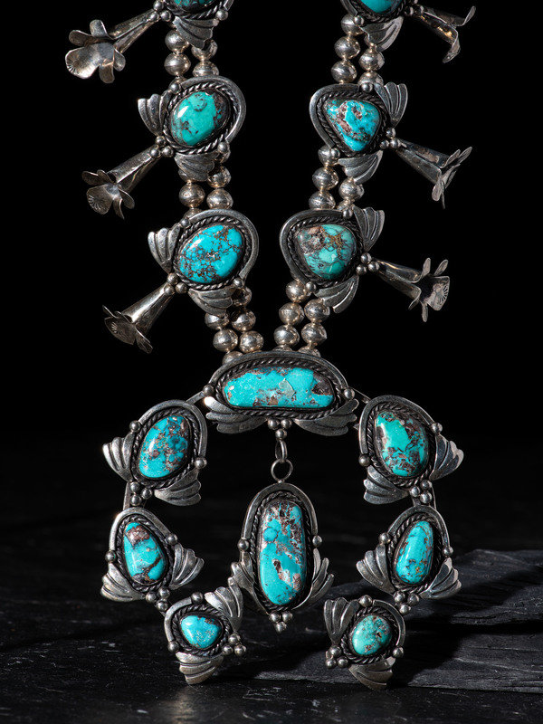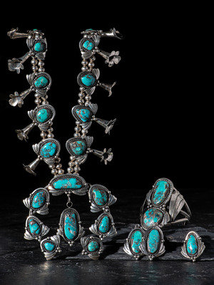 Navajo Silver and Turquoise Squash Blossom Necklace, Post Earrings, Ring, and Cuff Bracelet Set