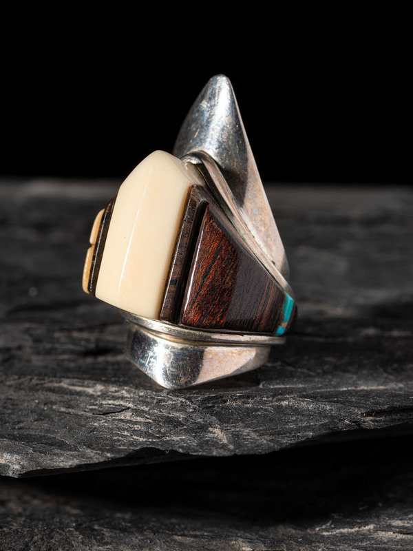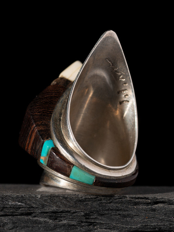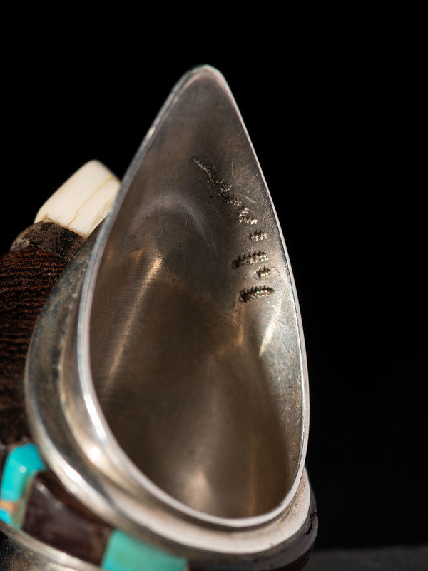 graduated and tapered design includes ironwood and turquoise inlay; etched LOLOMA