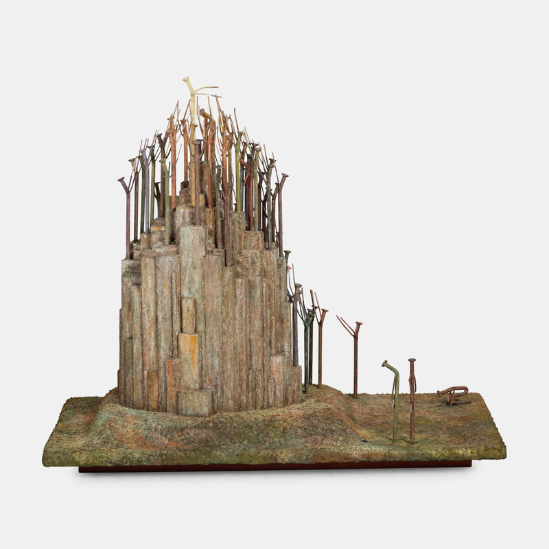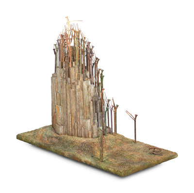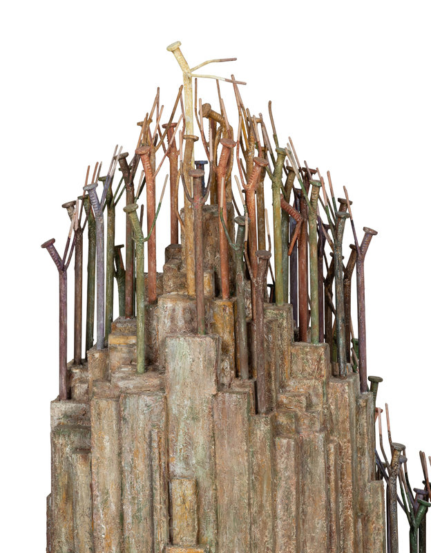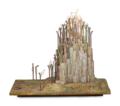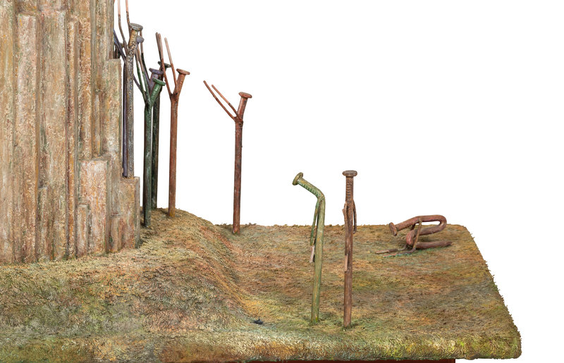 poluchromed assemblage of acrylic, cement, wood, terry cloth and various metals