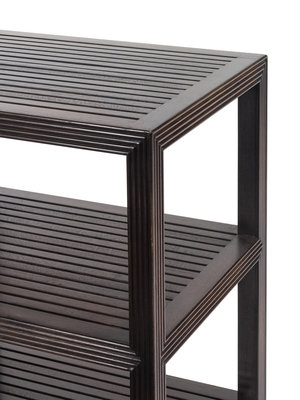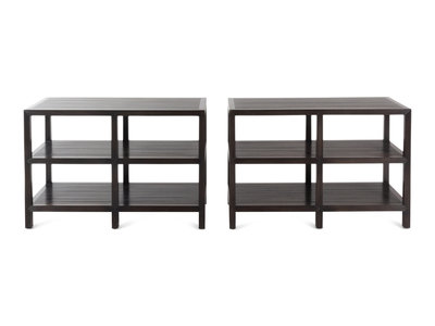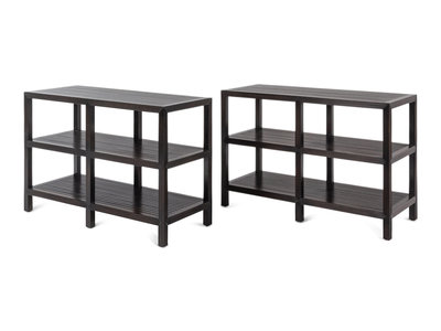 A Pair of Contemporary Stained Oak Three-Tier Console Tables