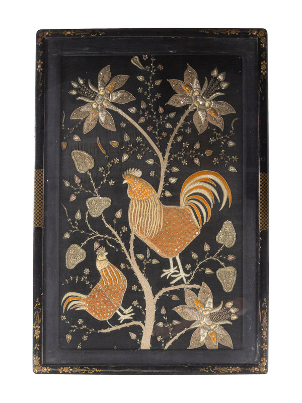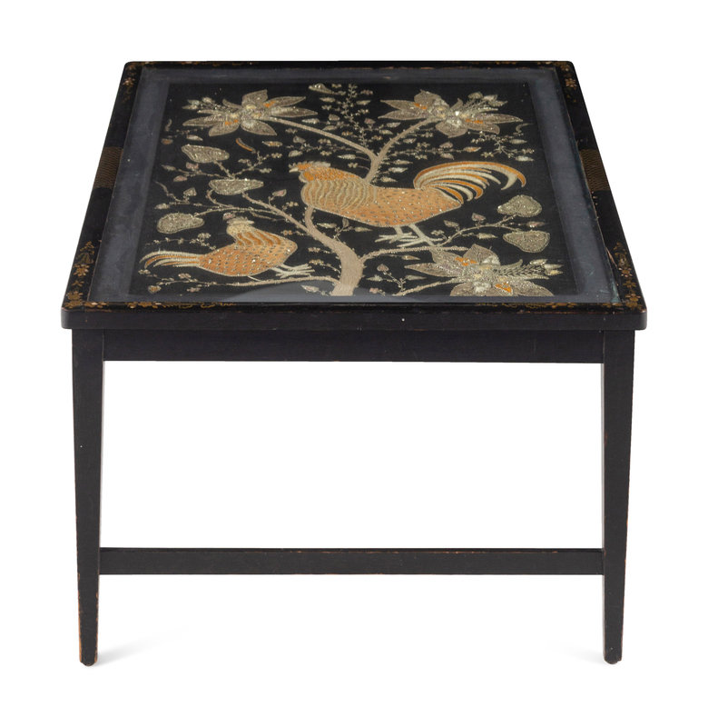A Chinoiserie Decorated Vitrine Table Inset with an Embroidered Beadwork Picture