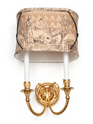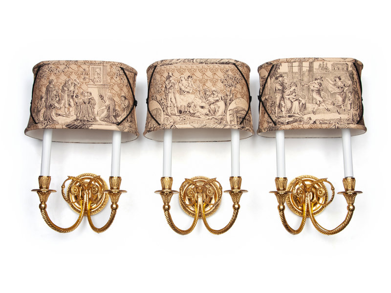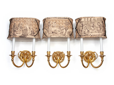 A Set of Three Gilt Metal Two-Light Sconces with Custom Shades