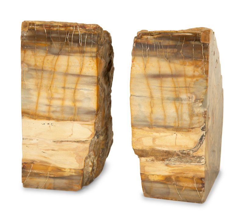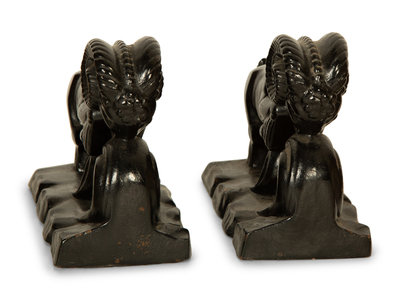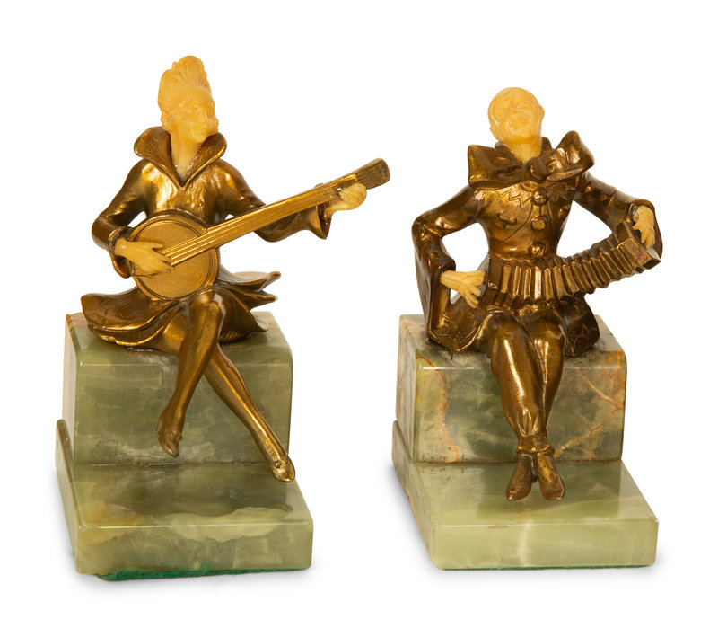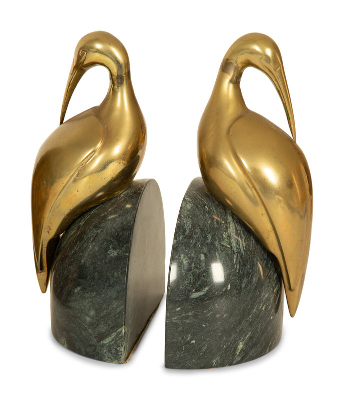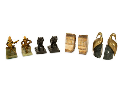 comprising a pair of brass ibis birds atop marble bases, a pair of black-painted cast metal rams, a pair of art nouveau style composition figures atop onyx bases, and a pair of petrified wood specimens.