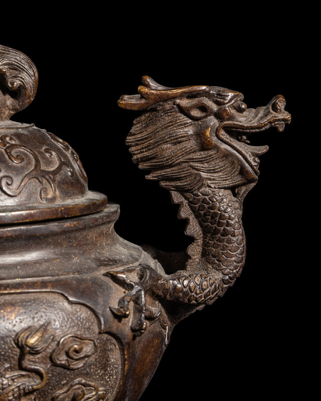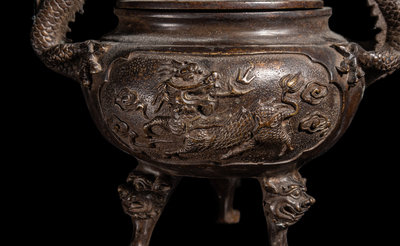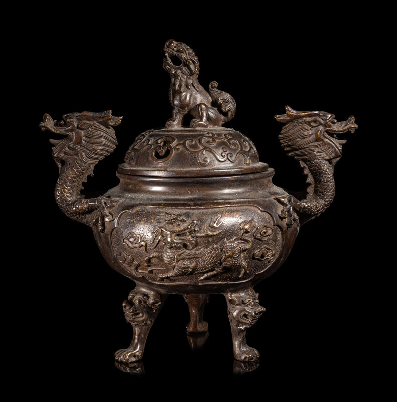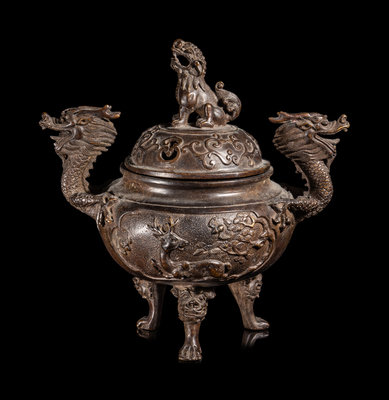 the compressed body cast to show panels enclosing a deer underneath pine trees and a qilin figure, raised on three paw feet, flanked by a pair of dragon head-form handles, the domed cover surmounted by a seated fu lion-form finial.