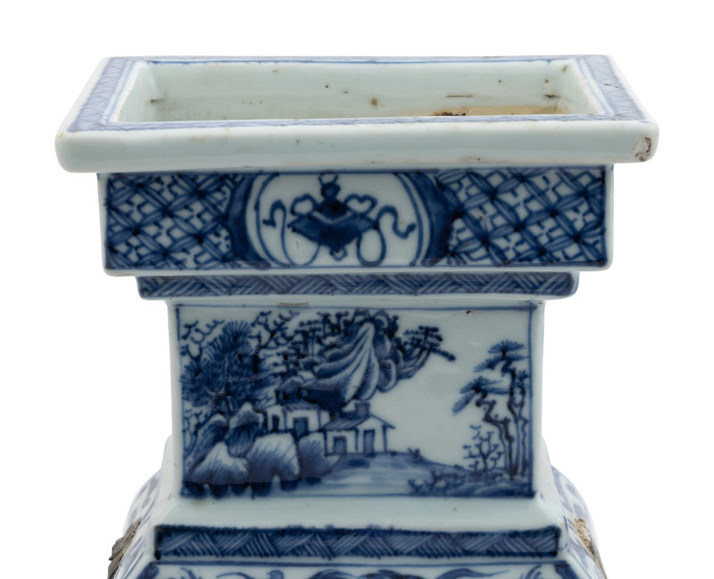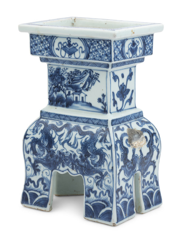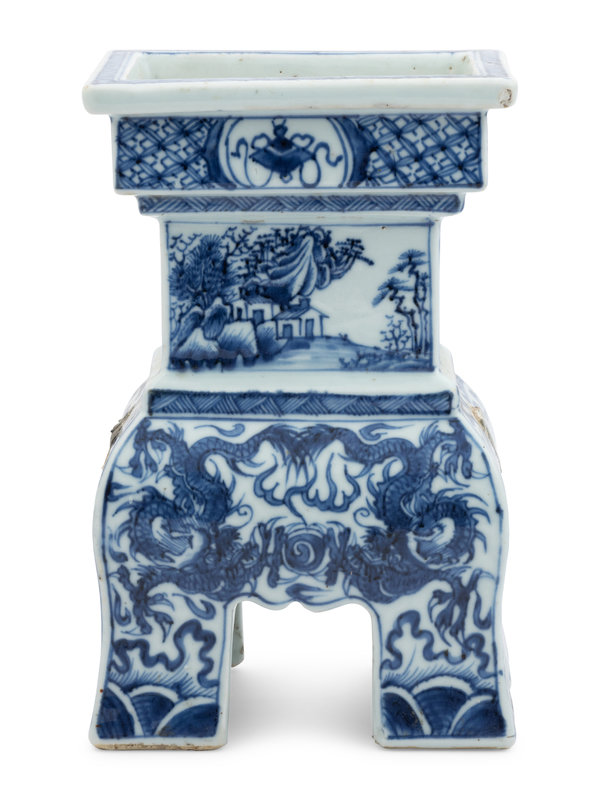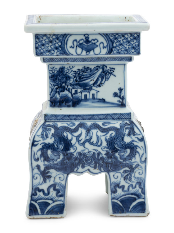 having a square body decorated with an illdylic landscape supported by four squat legs painted with dragon confronting over full waves.