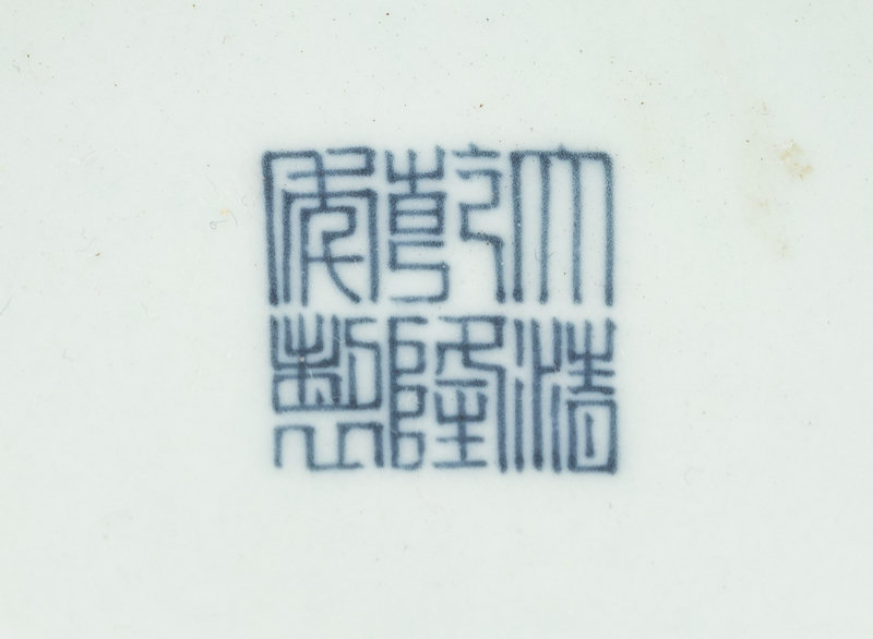 the globular body rising from a short foot to a slightly waisted neck and an everted mouth, molded with a pair of elephant head-form handles and mock rings, the underside bearing an apocryphal Qianlong six-character underglaze blue mark.