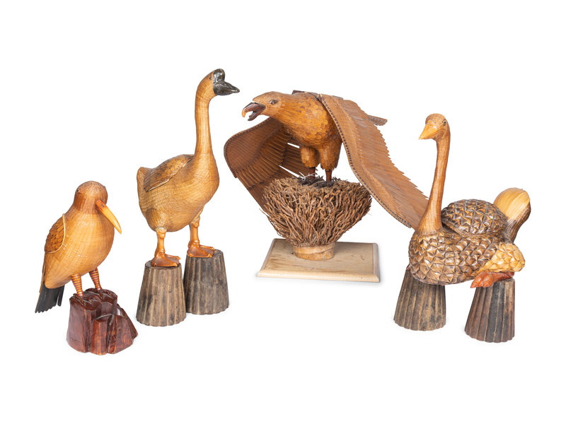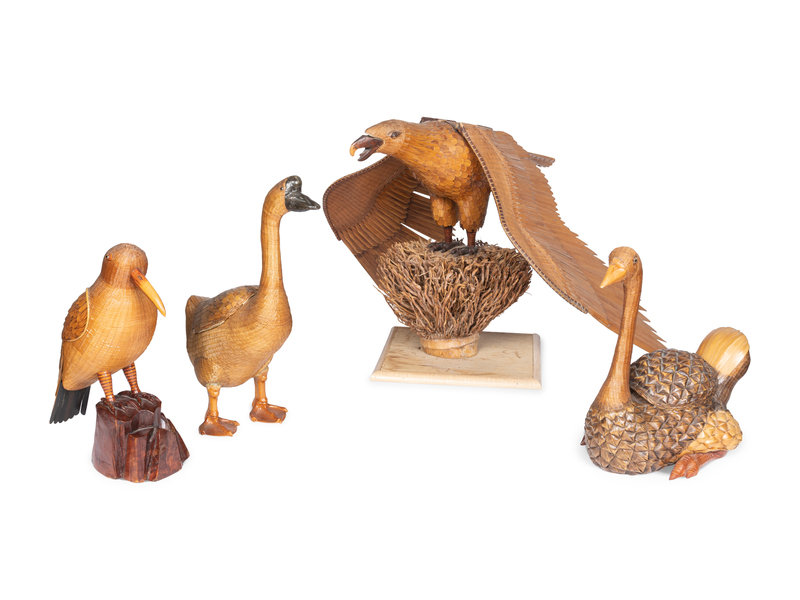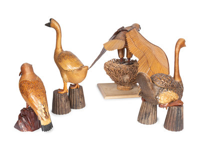comprising an eagle, seagull, goose, and swan, the goose, swan, and seagull supported by wooden stands.