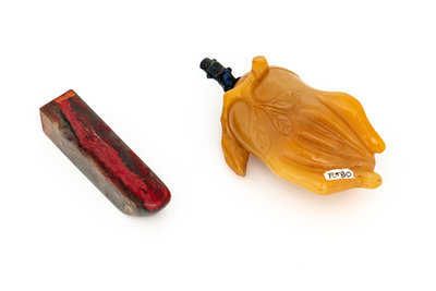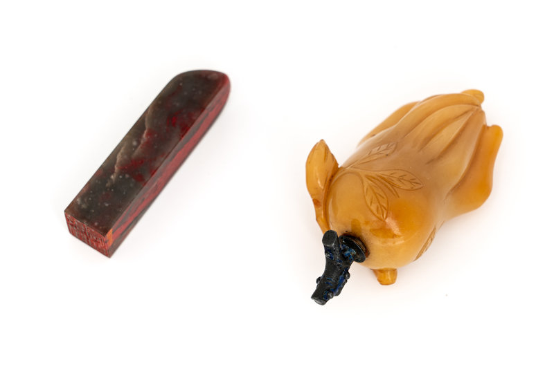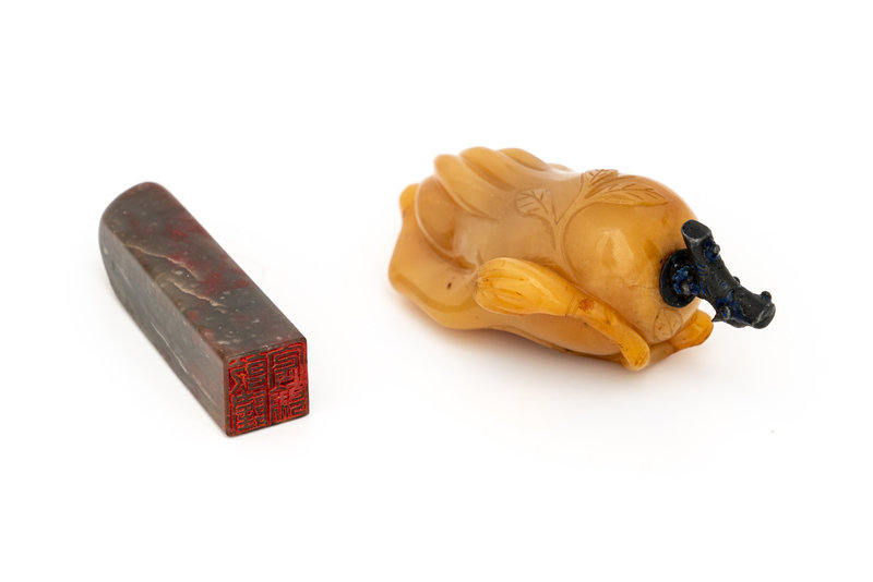 A Chinese Bloodstone Seal and A Yellow Hardstone Snuff Bottle
