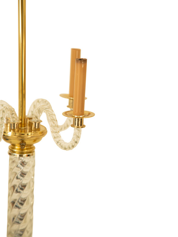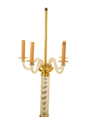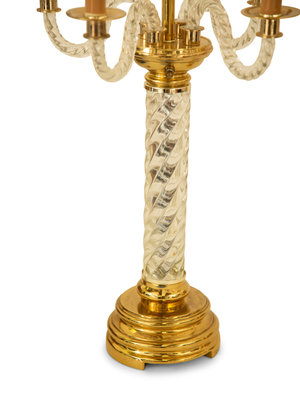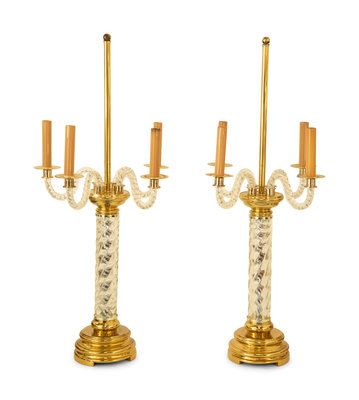 A Pair of Polished Brass and Pressed Glass Four-Light Table Lamps