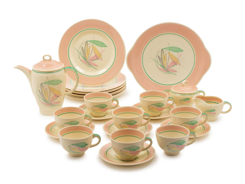 comprising a teapot, creamer, covered sugar bowl, eight teacups, six saucers, eight dessert plates, and one serving platter; 26 items total.