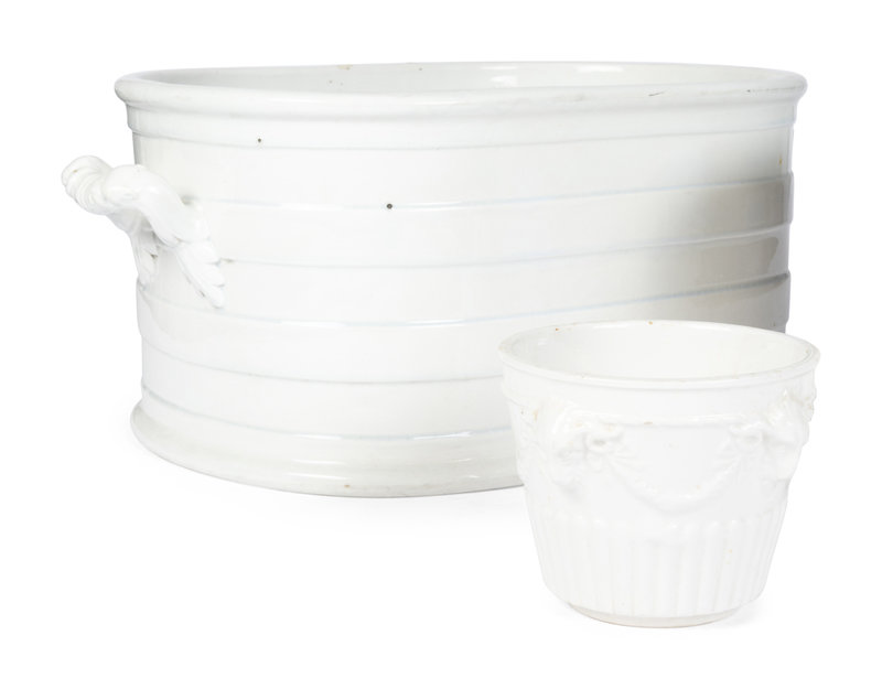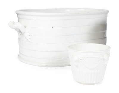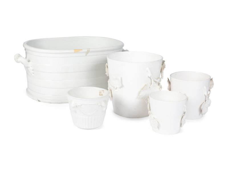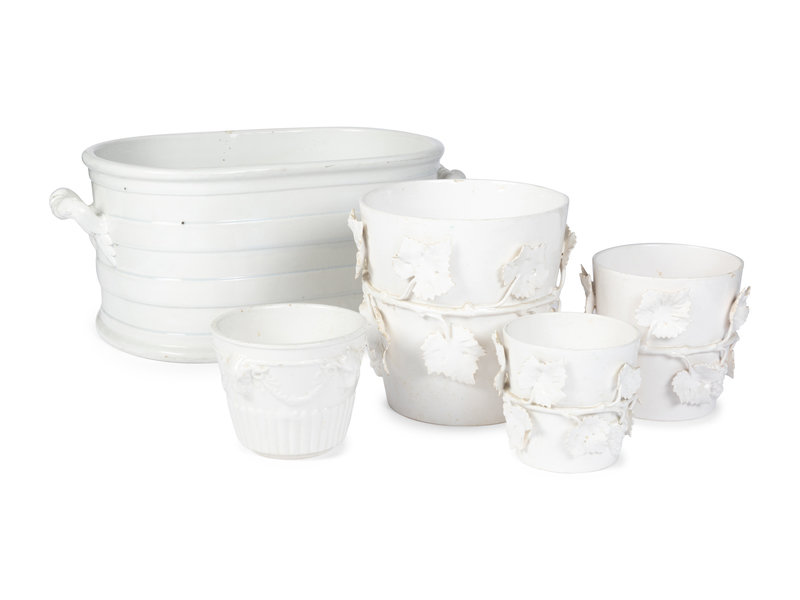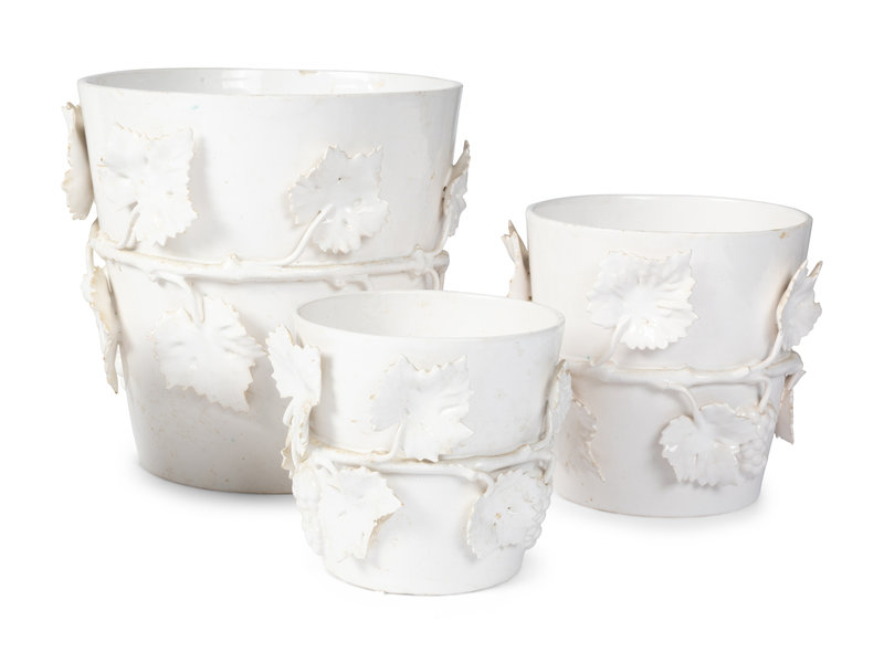 three of the jardinières decorated with raised trailing grape leaf and marked illegibly to the underside.