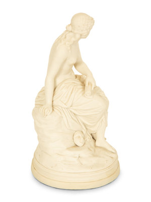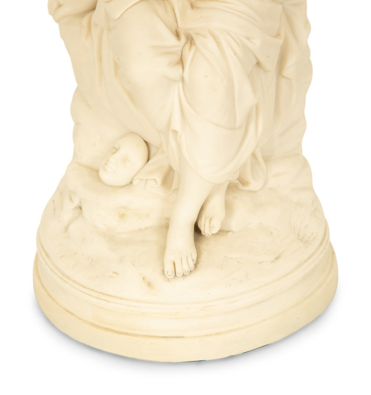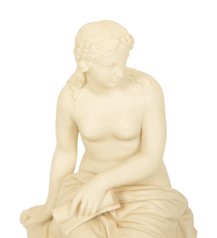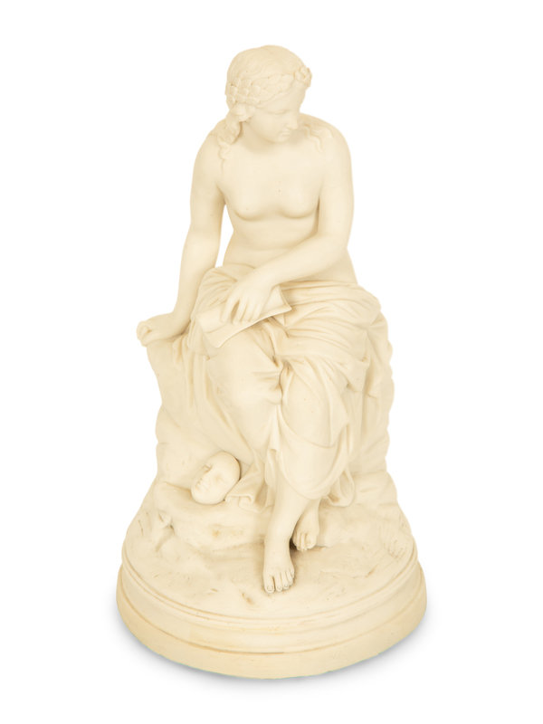 one a seated classical maiden; the other an Art Nouveau standing maiden, now mounted as a lamp with a clam shell shade.