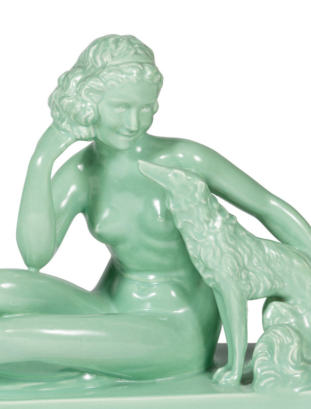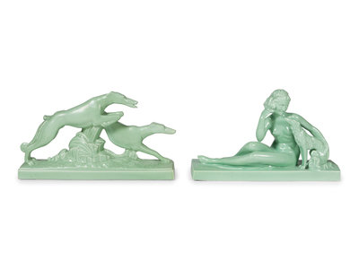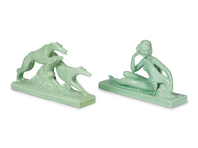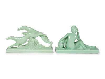the first depicting two greyhounds in motion, the second with a seated female figure accompanied by a dog, each impressed with LEMANCEAU to the base and the female figure stamped to the underside.