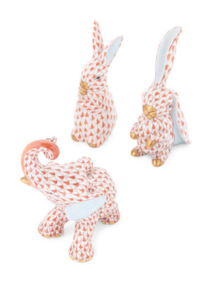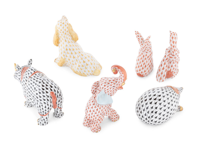 comprising a spaniel, elephant, rhinocerous, hedgehog, and two rabbits; each marked to the underside.