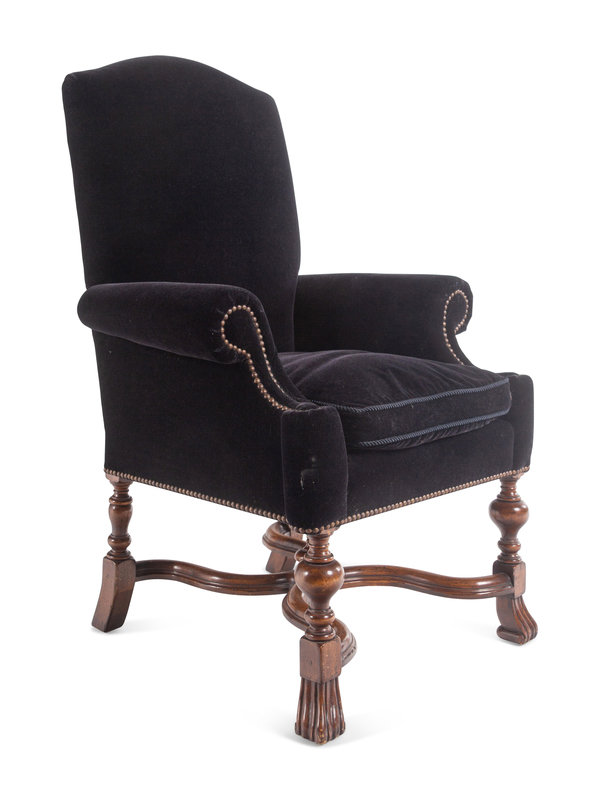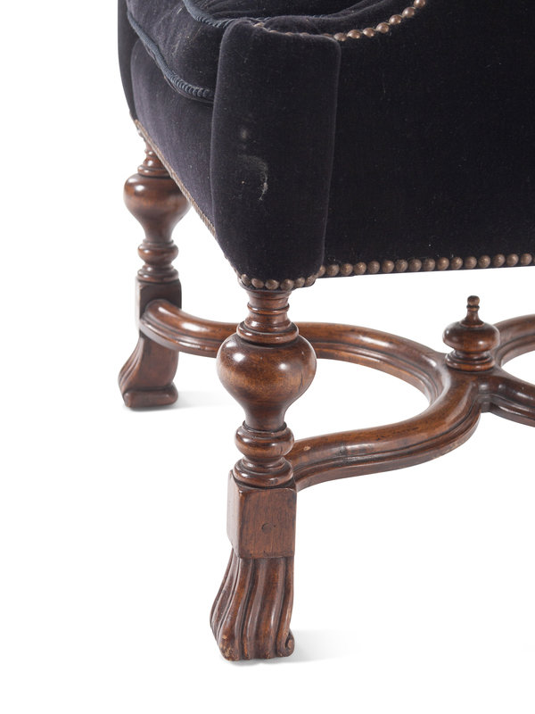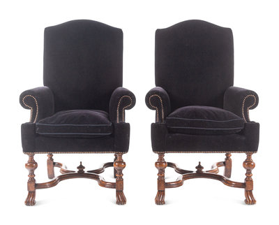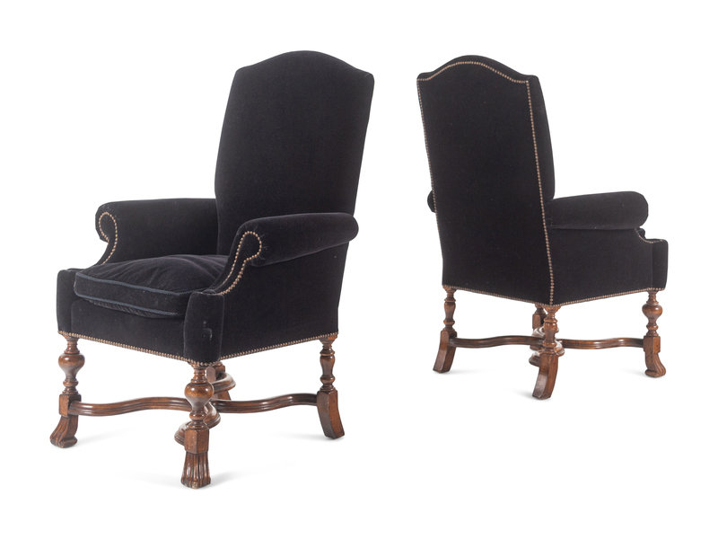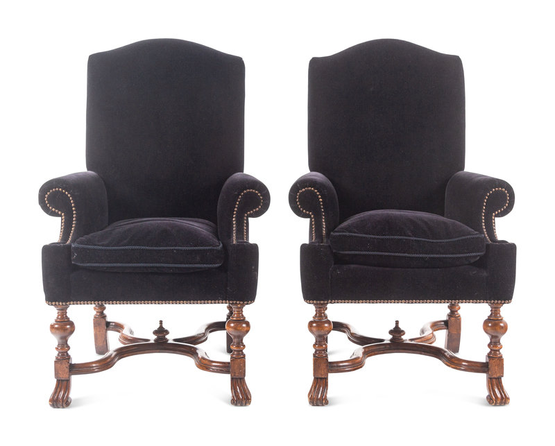 A Pair of William and Mary Style Velvet-Upholstered Walnut Armchairs