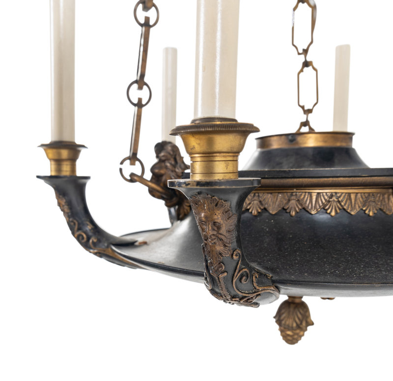 An Empire Style Gilt Bronze and Tole Six-Light Chandelier
