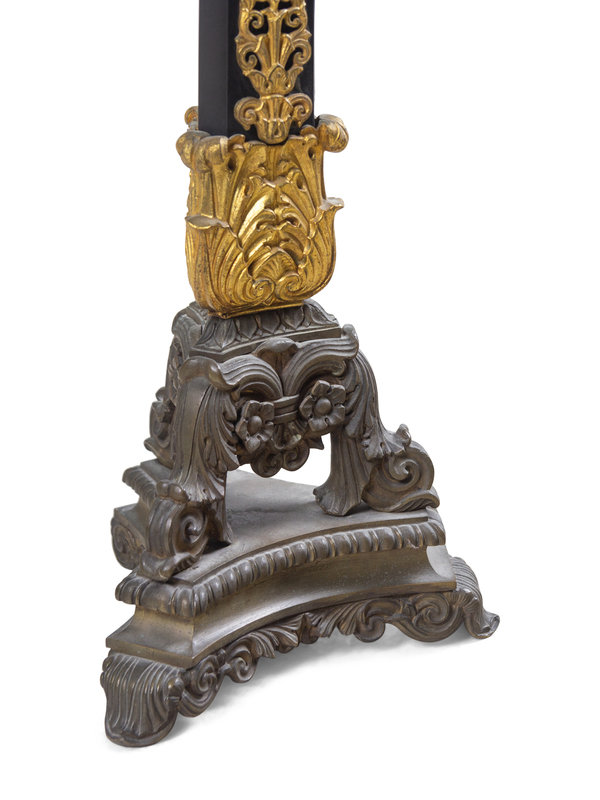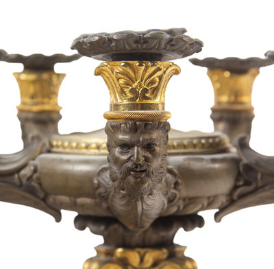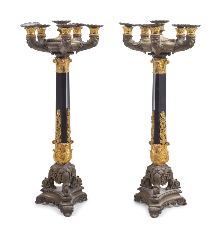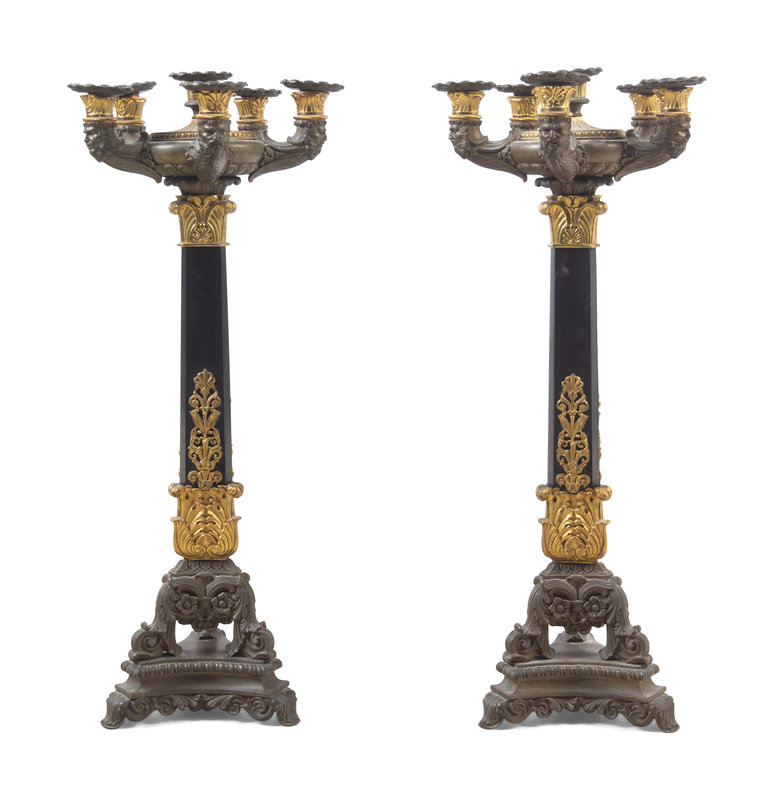 A Pair of Charles X Gilt and Patinated Bronze Six-Light Candelabra