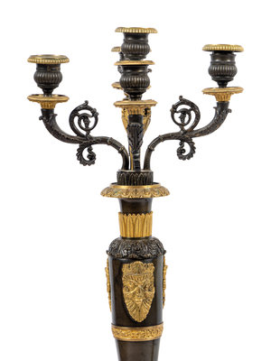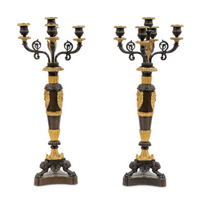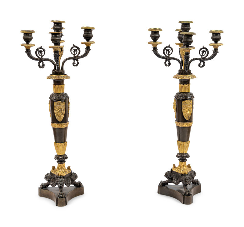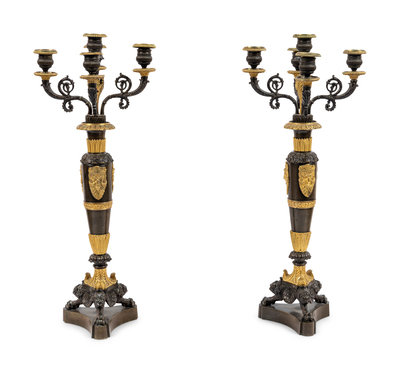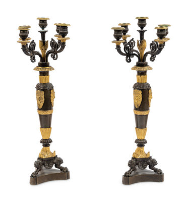 A Pair of Louis Philippe Gilt and Patinated Bronze Five-Light Candelabra