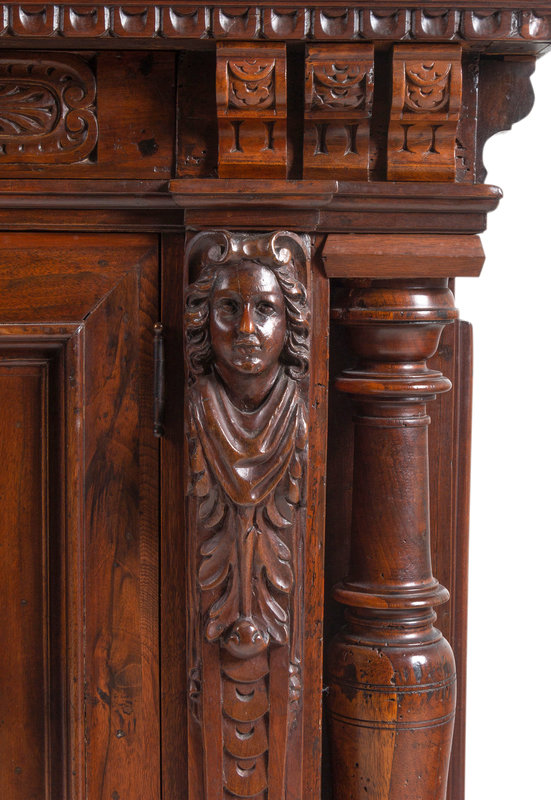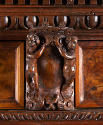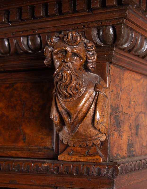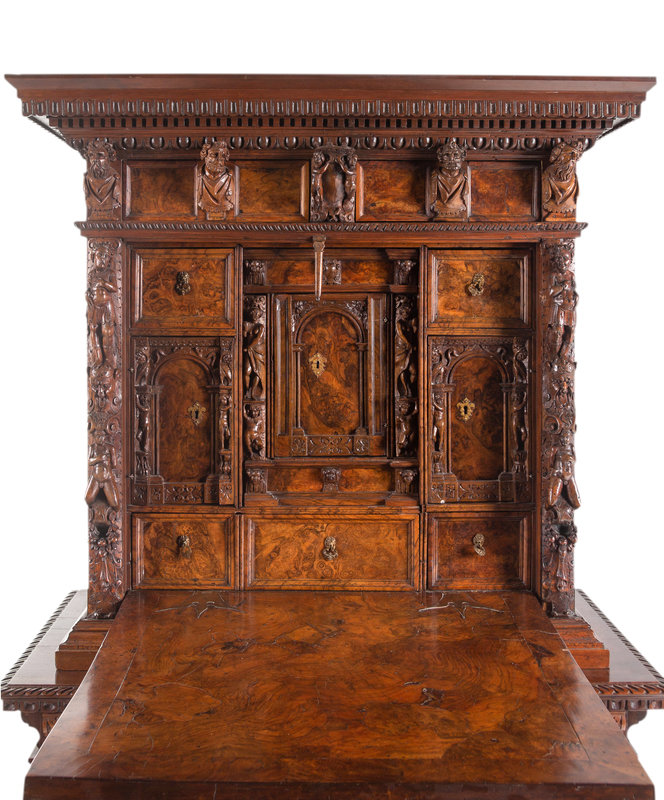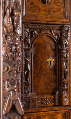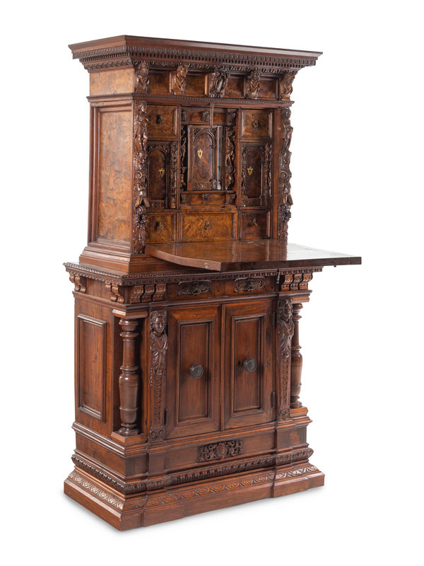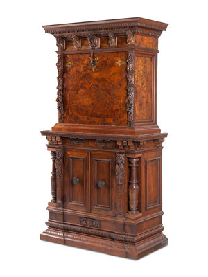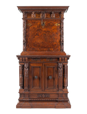 An Italian Baroque Style Carved Walnut and Burl Walnut Fall-Front Bureau Cabinet