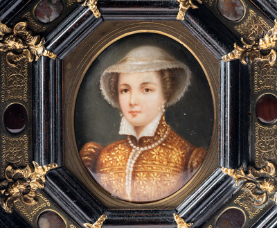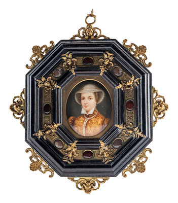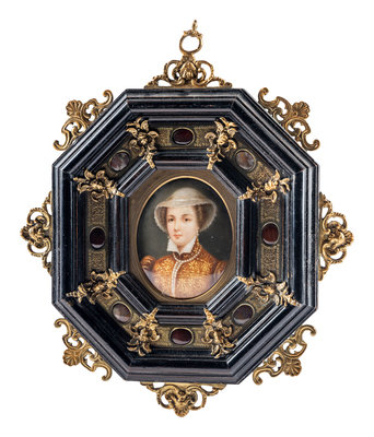 set with a painted porcelain portrait plaque depicting a lady in Renaissance attire, the plaque bearing impressed Hutschenreuther CMHR mark in a circle and further impressed 15 to the verso.