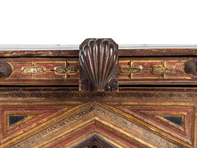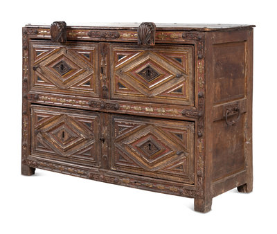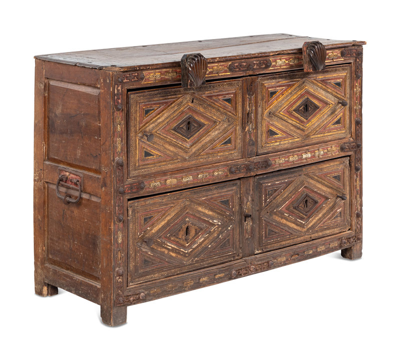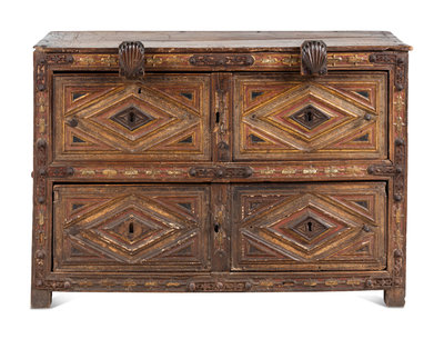 A Spanish Iron Mounted Red-Stained and Parcel-Gilt Walnut Vargueno Base