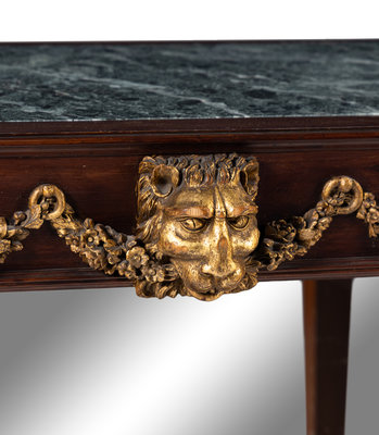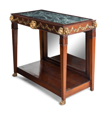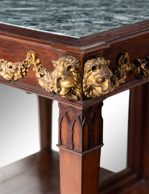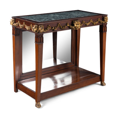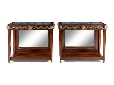 A Pair of Portuguese Gilt Bronze Mounted and Marble-Inset Mahogany Pier Tables