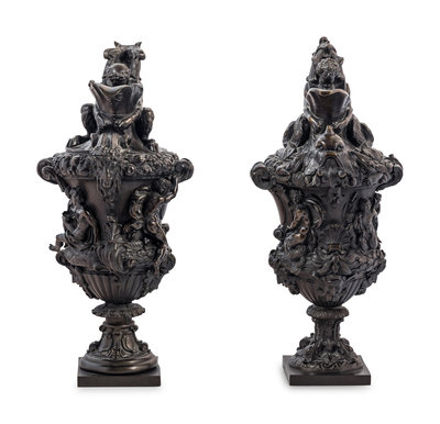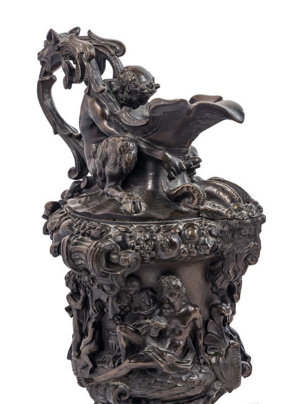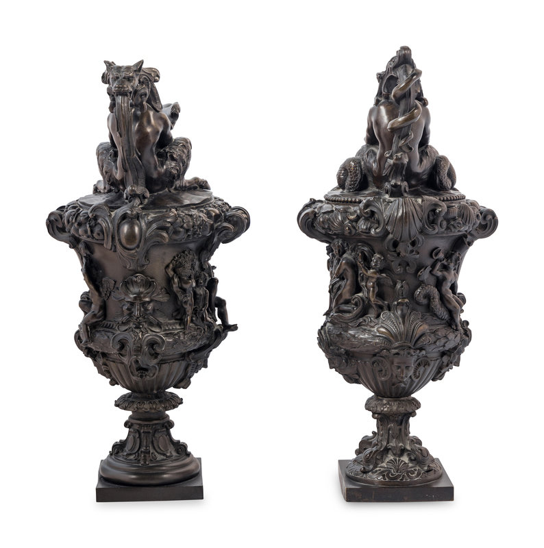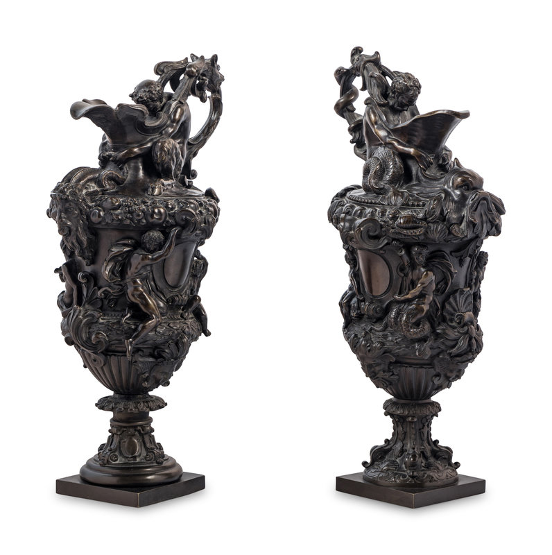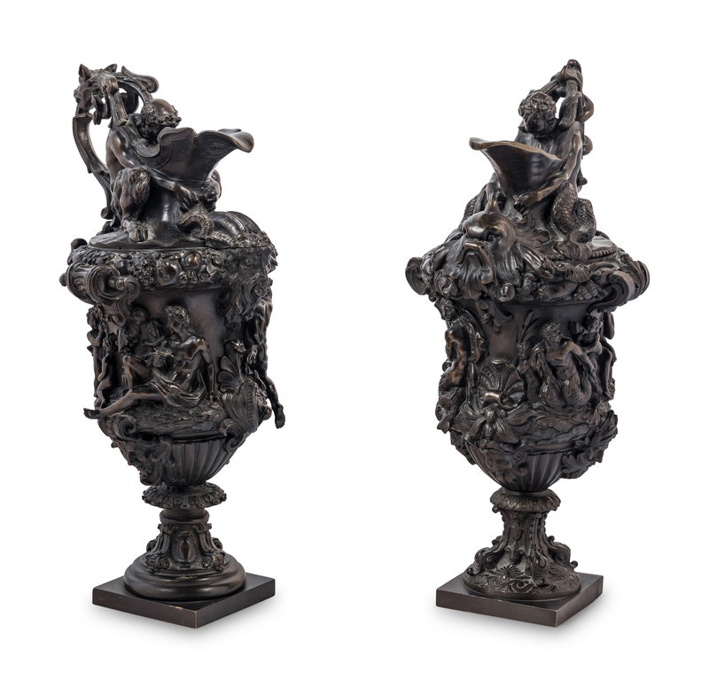 A Pair of Grand Tour Bronze Ewers Emblematic of Water and Earth