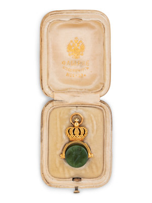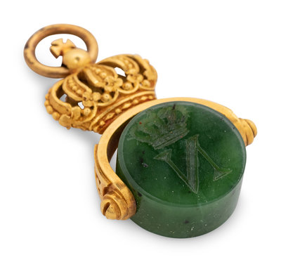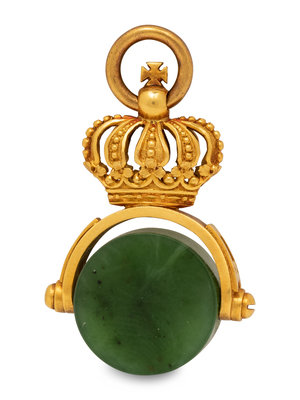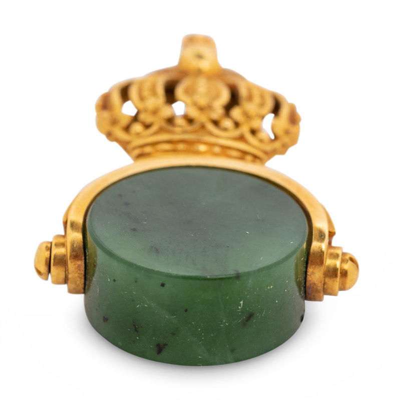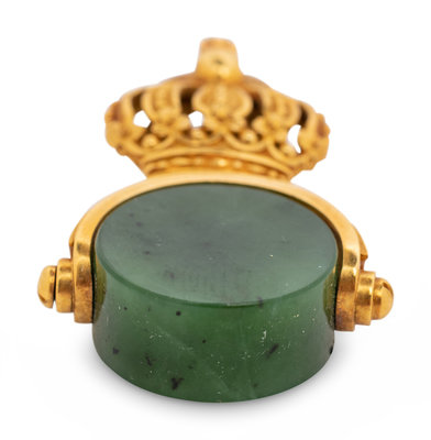 A Russian Yellow Gold and Carved Nephrite Swivel Seal