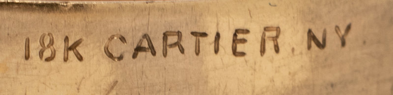 one monogrammed to the lid and stamped 18K Cartier NY to the rim of the body, one stamped Cartier 14KT to the edge of the lid, one stamped 5 and 14K to the interior.