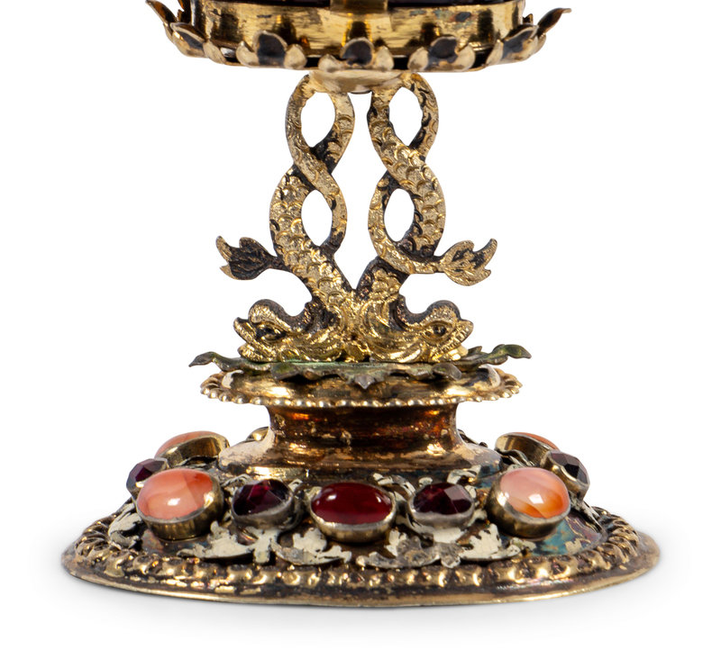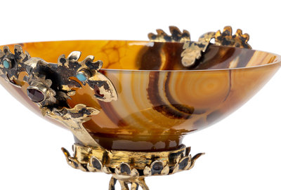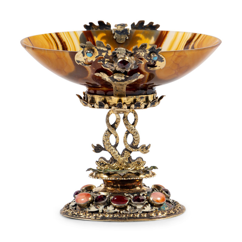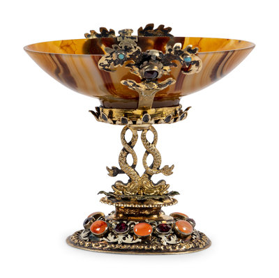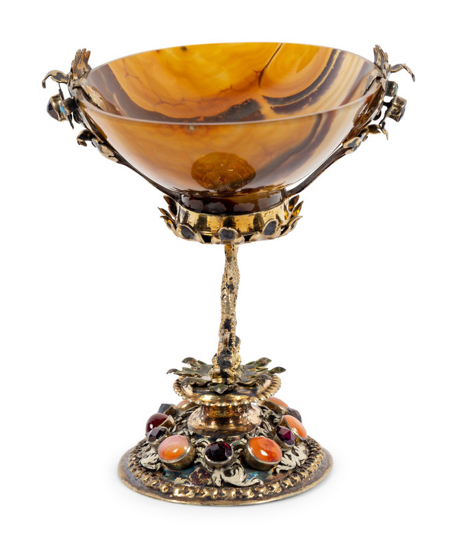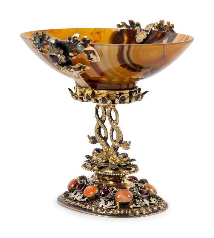A German Enameled Silver-Gilt, Jewel and Carved Agate Cup