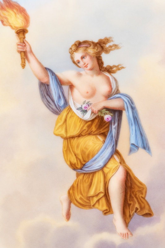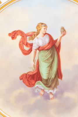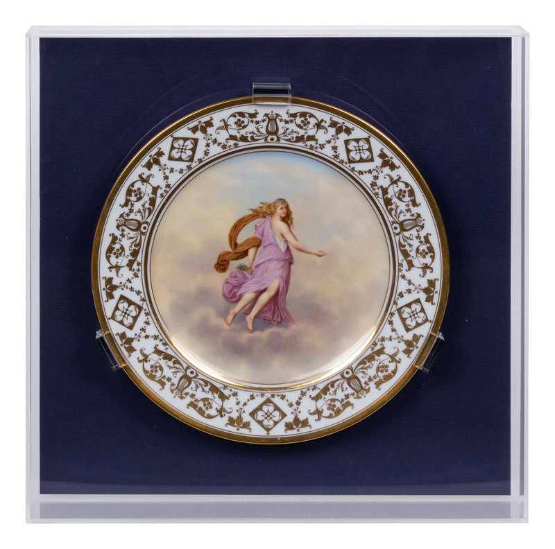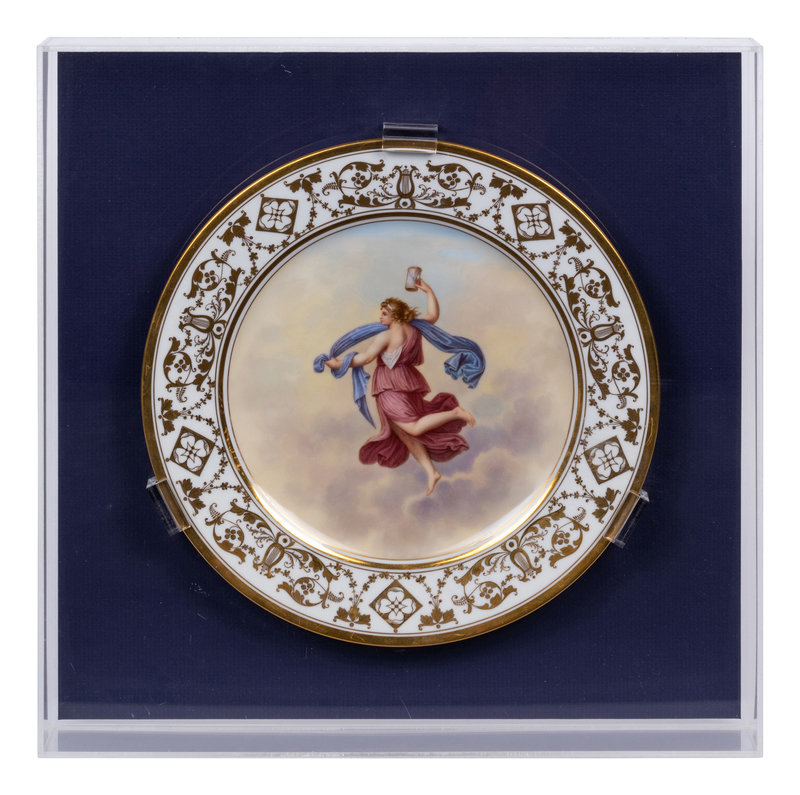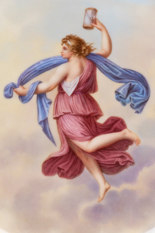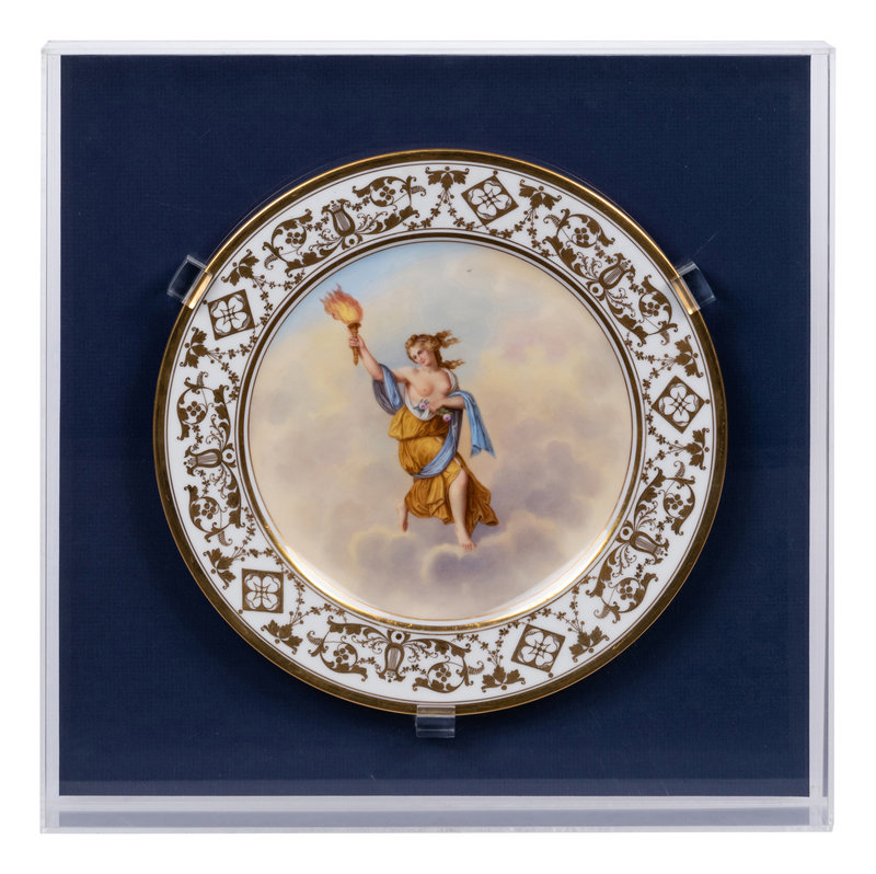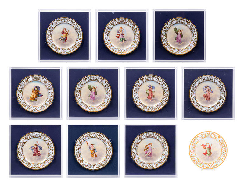 each decorated with a maiden representing an hour after Raphael Sanzio d’Urbino’s Hours of Day and Night; eleven encased in acrylic shadowboxes.