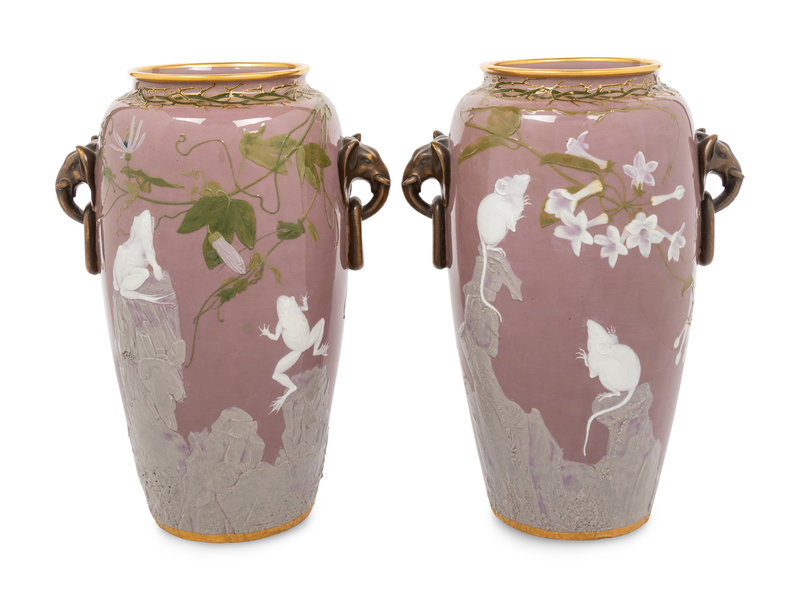 decorated with frog and mouse motifs; both stamped and impressed Mintons to the underside, incised 1.1, and respectively incised 1766 and 1776 to the underside.
