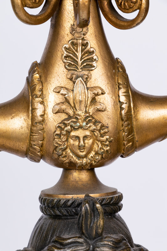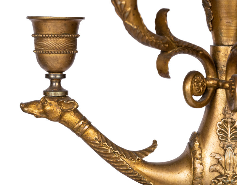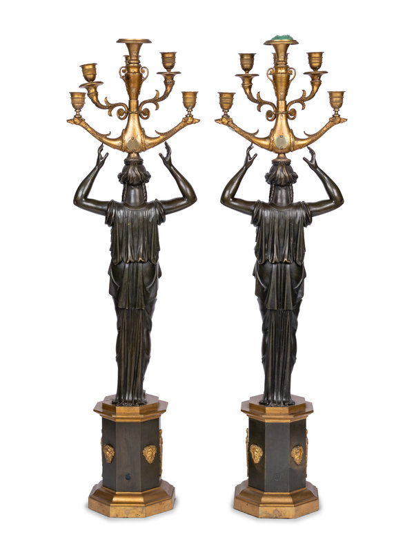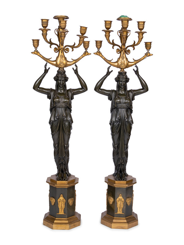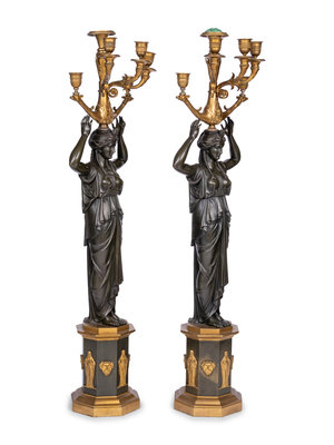 A Pair of Empire Style Gilt and Patinated Bronze Six-Light Figural Candelabra
