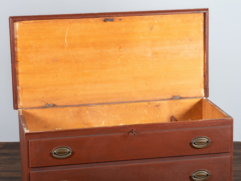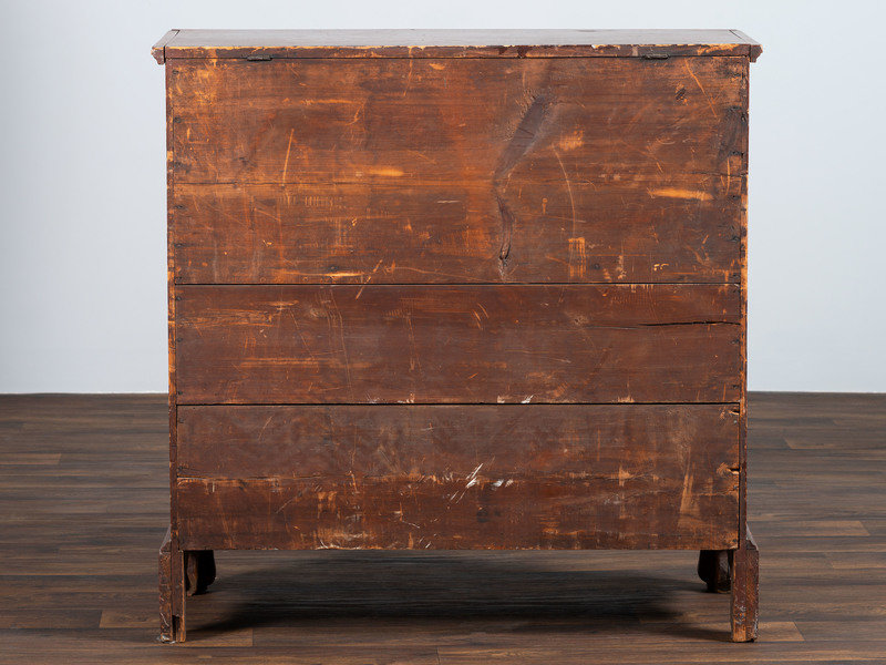 appears to retain the original hinges, the drawer pulls are stylistically right though there is a history of knobs having been on the chest.
