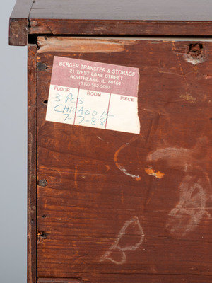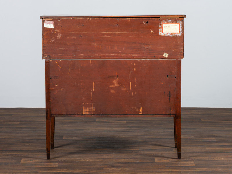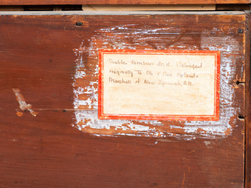 bearing a paper label to the reverse inscribed Double tambour desk Belonged originally to Mr. + Mrs. Orlando Marshall of New Ipswich, N.H.; drawer pulls are replaced.