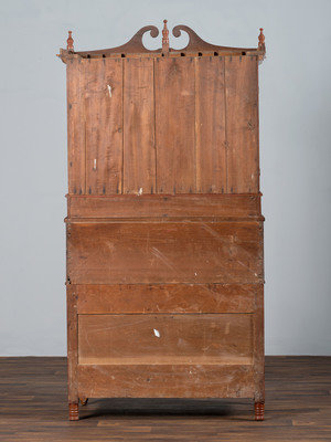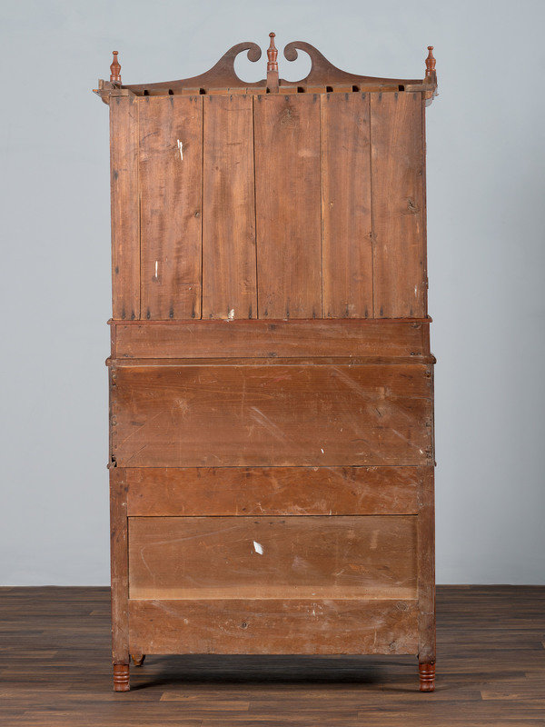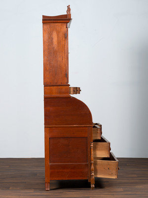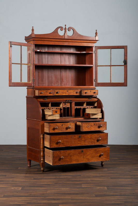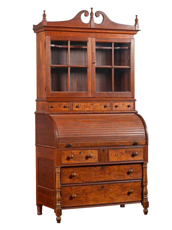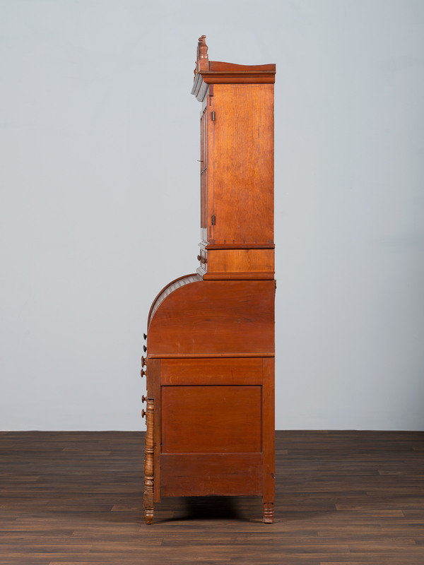 A Late Federal Cherry Wood and Tiger Maple Roll-Top Desk-and-Bookcase