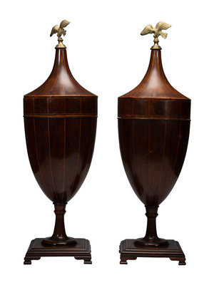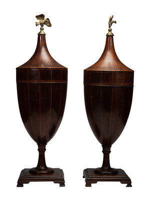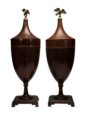 A Pair of George III-Style Satinwood-Inlaid Mahogany Cutlery Urns