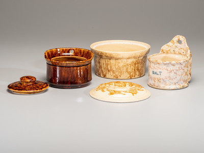 including two mixing bowls, two lidded jars, two jugs, two hanging salt canisters, two oval bowls, a dog figure, a modern vase, a molded plate, and a footed cup and bowl.