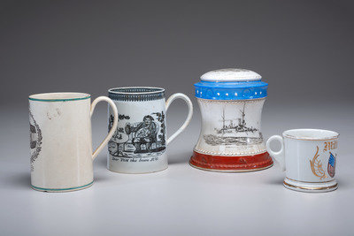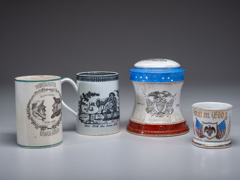 A Wheeling Pottery Dewey’s Flagship Covered Jar and Patriotic Shaving Mug