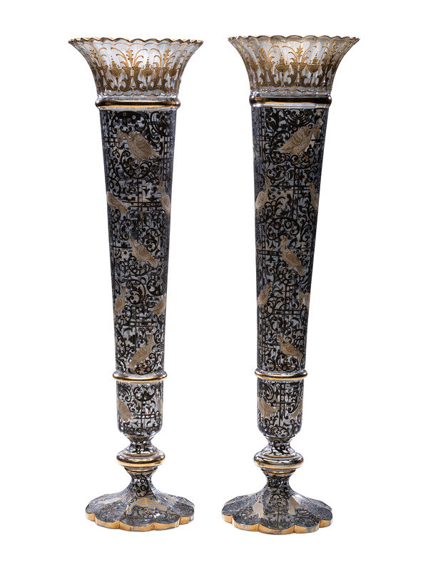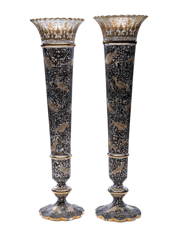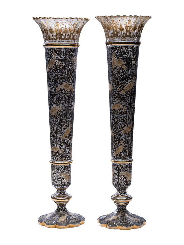 A Pair of Gilt and Paint Decorated Glass Trumpet Vases