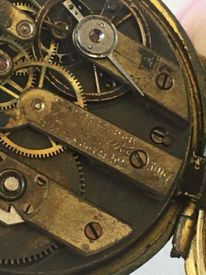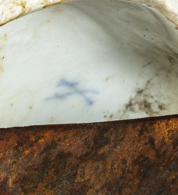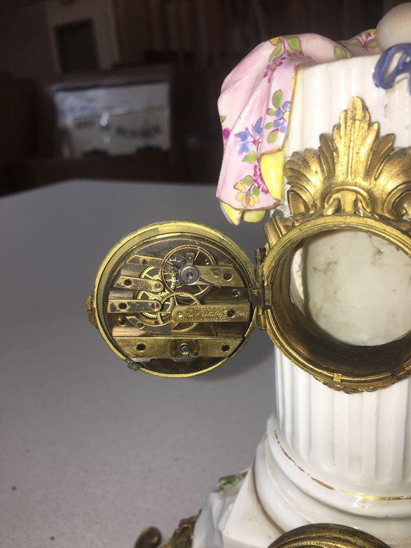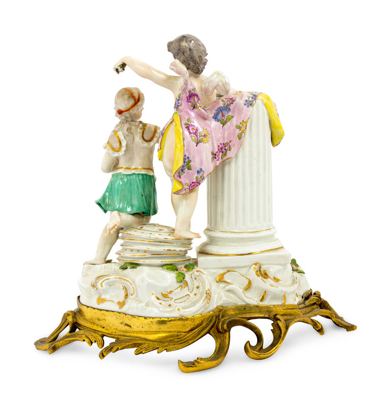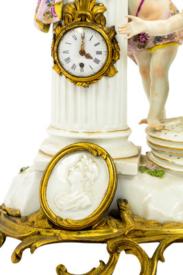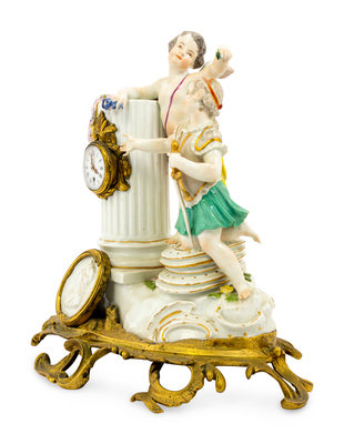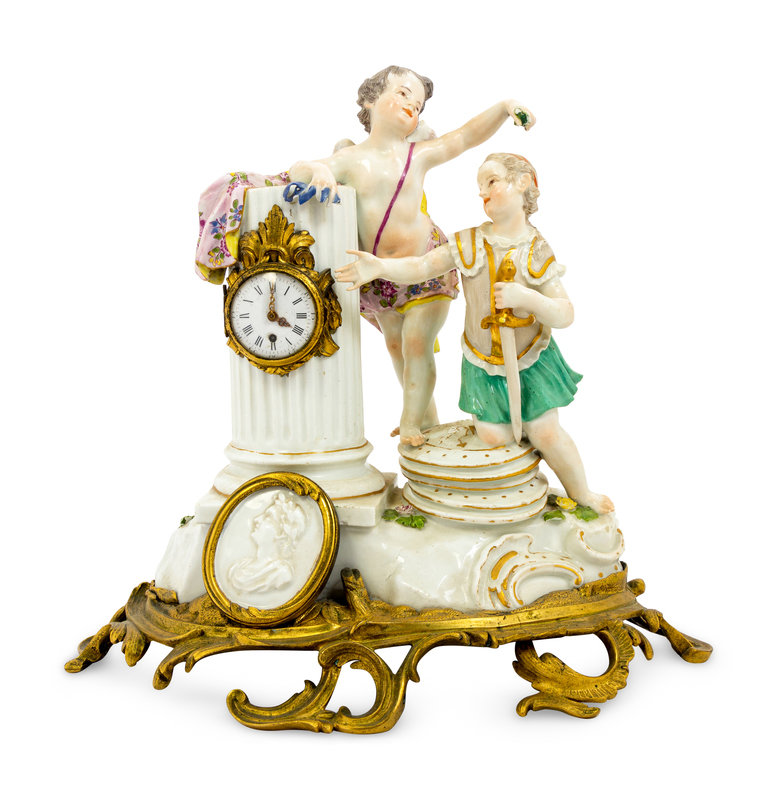 bearing double crossed swords in underglaze blue, with a gilt and enamel clock on a gilt bronze base.