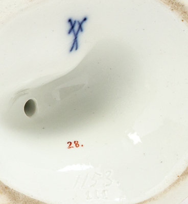bearing double crossed swords in underglaze blue, with impressed numbers 111 and 85, inked numbers 28 and incised numbers 1153 and 1160.