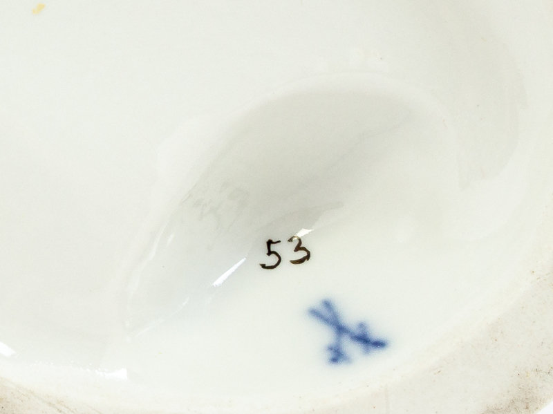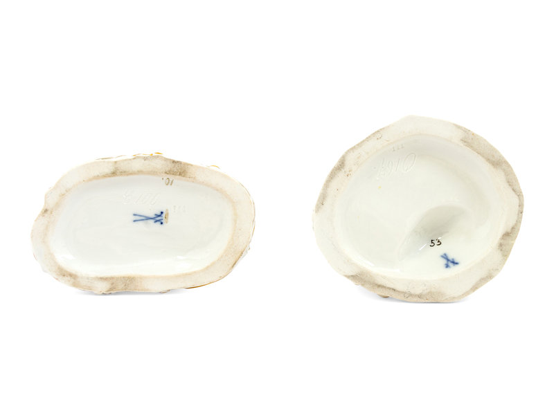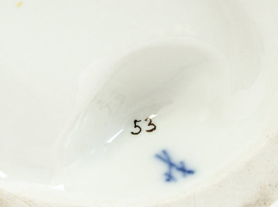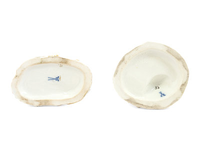 each bearing double crossed swords in underglaze blue, with impressed numbers 111, inked number 53 and incised initials O167 on the cherub cutting fabric, and impressed numbers 111, inked number 10 and incised initials C100 on the boy planting trees.