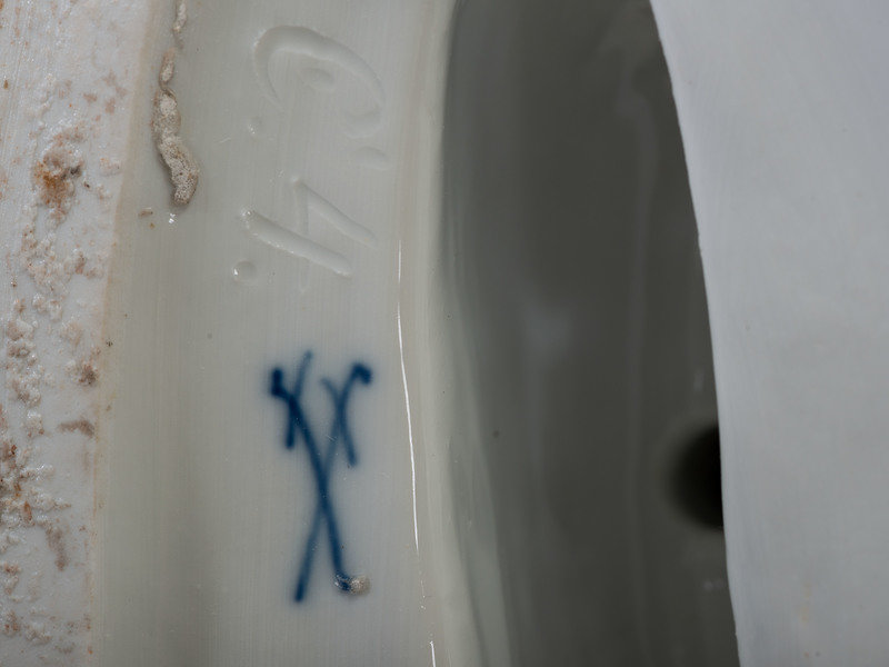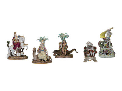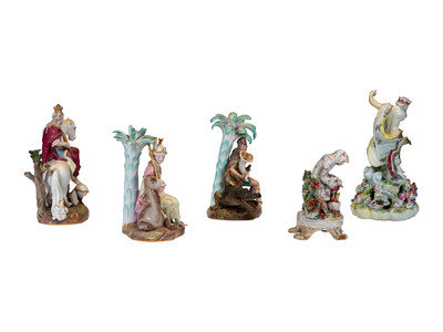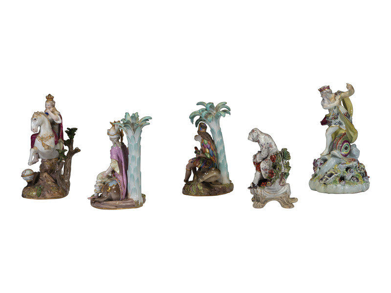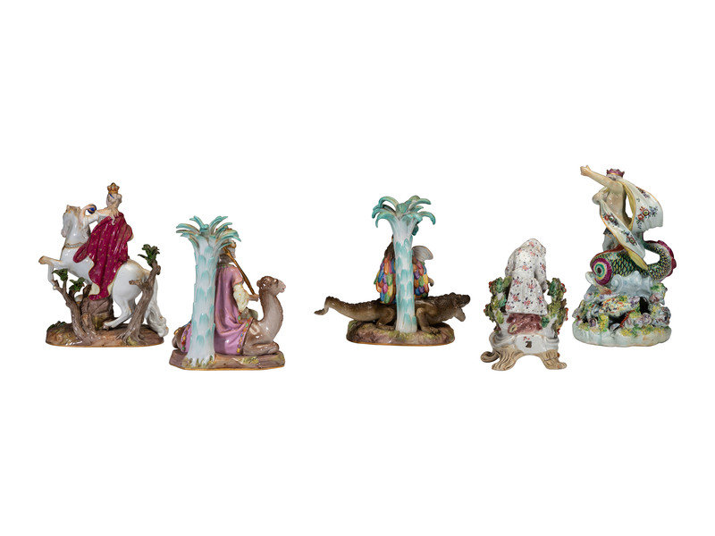 comprising three Meissen figures each with maker's mark to underside, a Bow figure with maker's mark to back, and an unmarked figure.